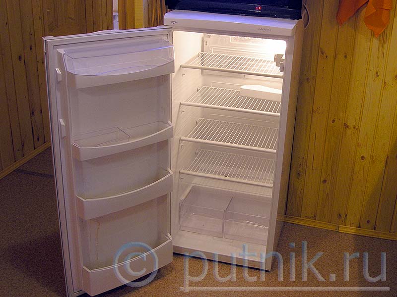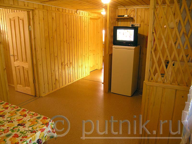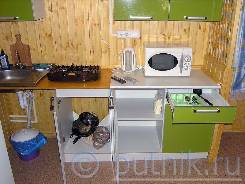 Особенность домика 2 — холодильник здесь без морозилки. Посуда имеется в комплекте на 4 человек, включая кастрюли и сковородки.
