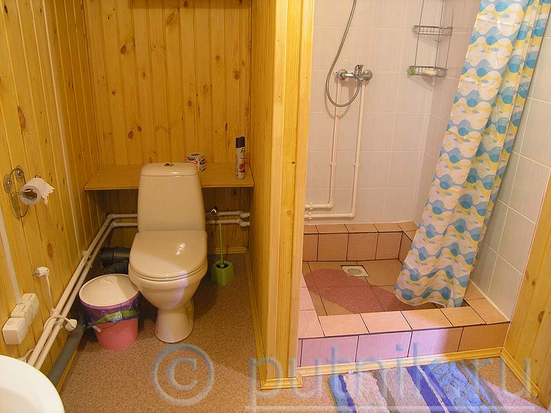 При входе из коридора есть дверь в санузел с душевой кабиной и современным туалетом.
